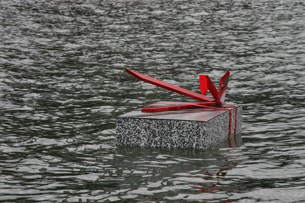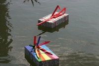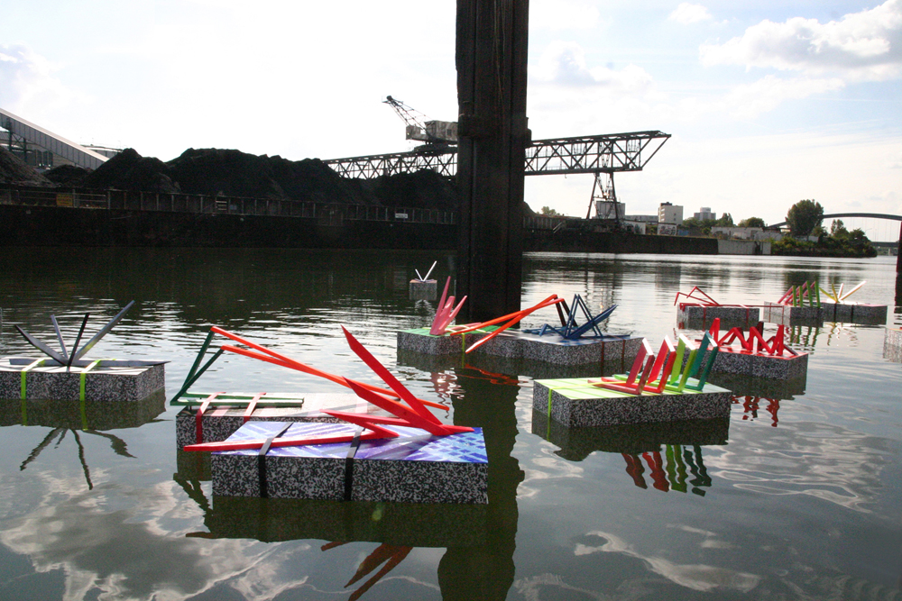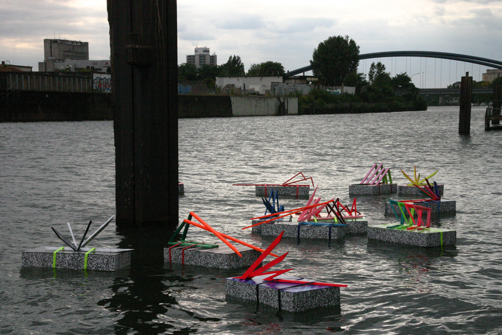 29 Die Tanzmücken (auch als Zuckmücken bekannt), deren Mundwerkzeuge nicht zum Stechen und Blutsaugen geeignet sind, dienen der Bildhauerin Catharina Cronenberger Golebiowska als Leitgedanke für ihre zauberhafte und farbenprächtige Installation auf dem Main. Sie lässt abstrahierte Skulpuren (in Anlehnung an die Tanzmücken) auf schwarzsilbernen Flössen, wie Bojen, in Ufernähe auf dem Wasser schwimmen. Die visuelle Interpretation der immer in Bewegung zuckenden Mücken fi ndet einen Ausgleich in den ruhenden Skulpturen und evoziert einen sinnlichen Farben-Tanz.